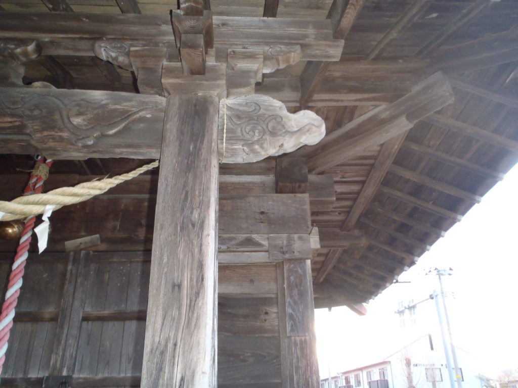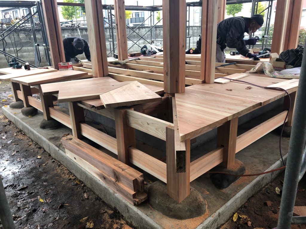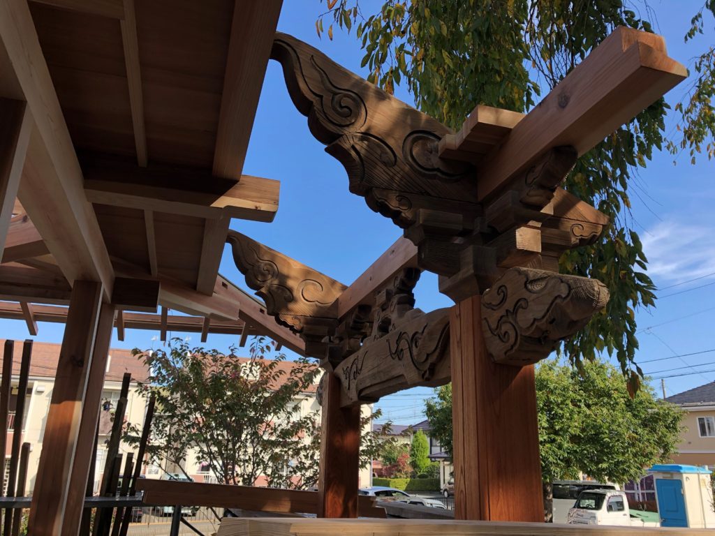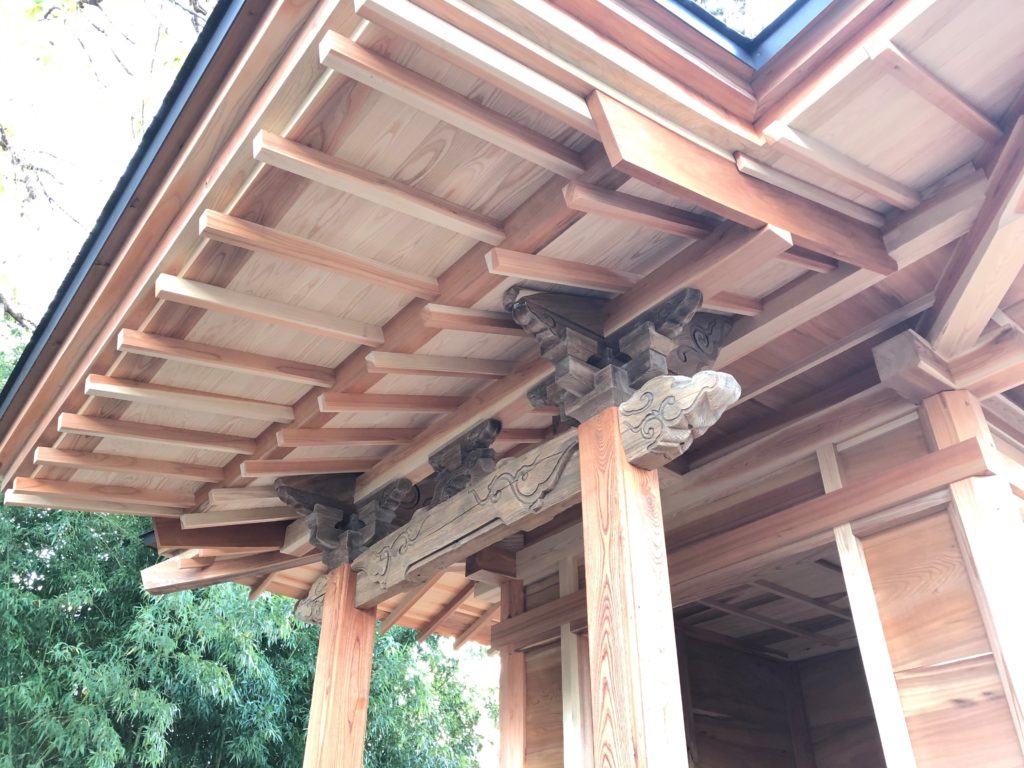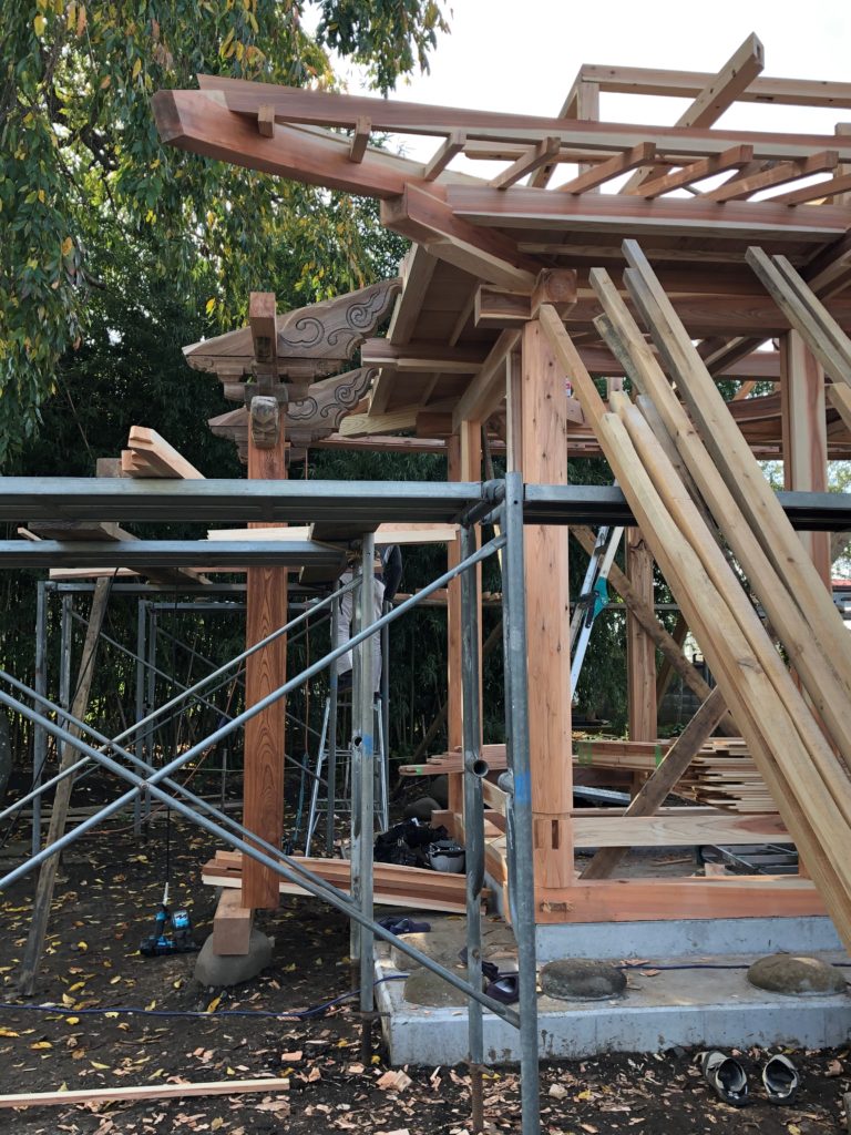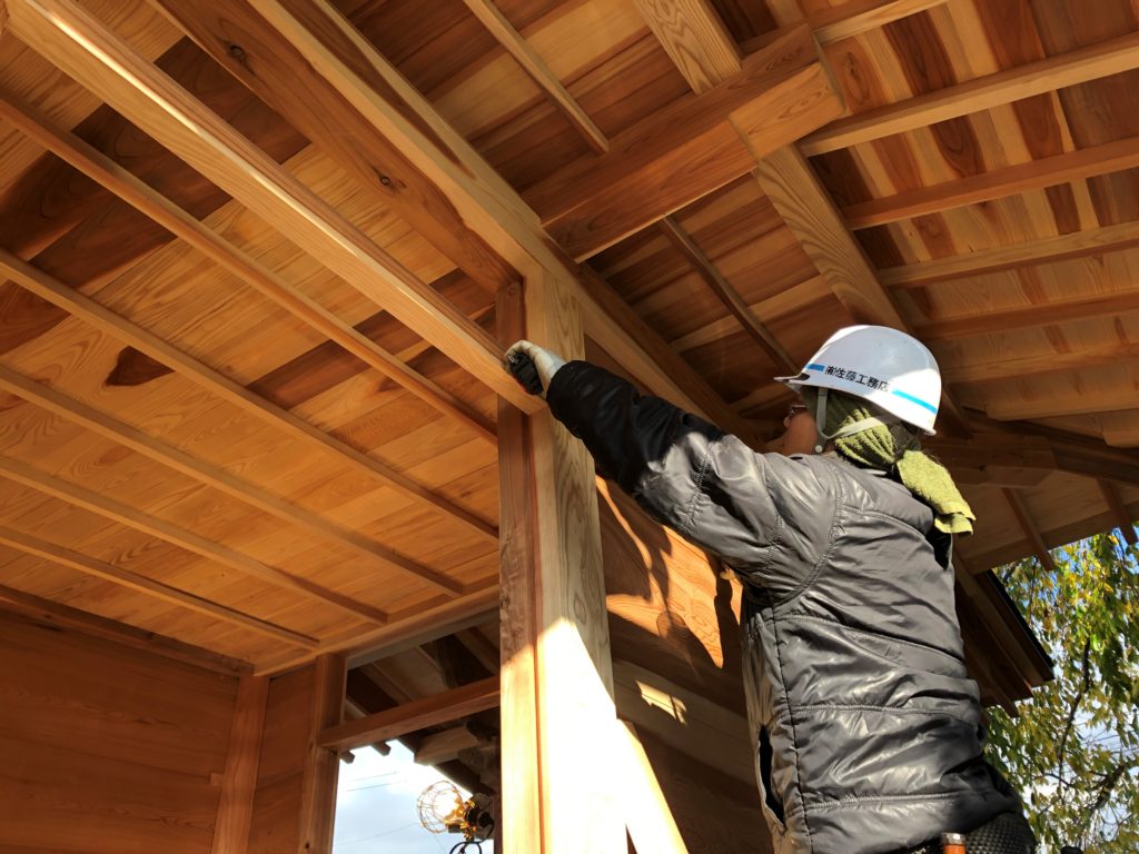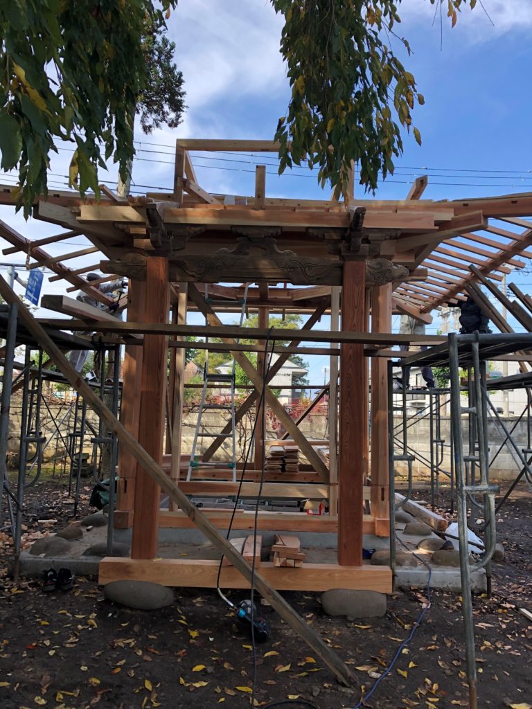 毘沙門堂 建て方の続き。以前使われていた虹梁が再利用され、躯体に組み込まれました。