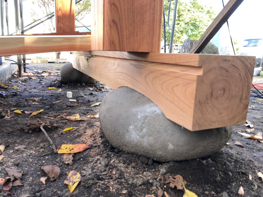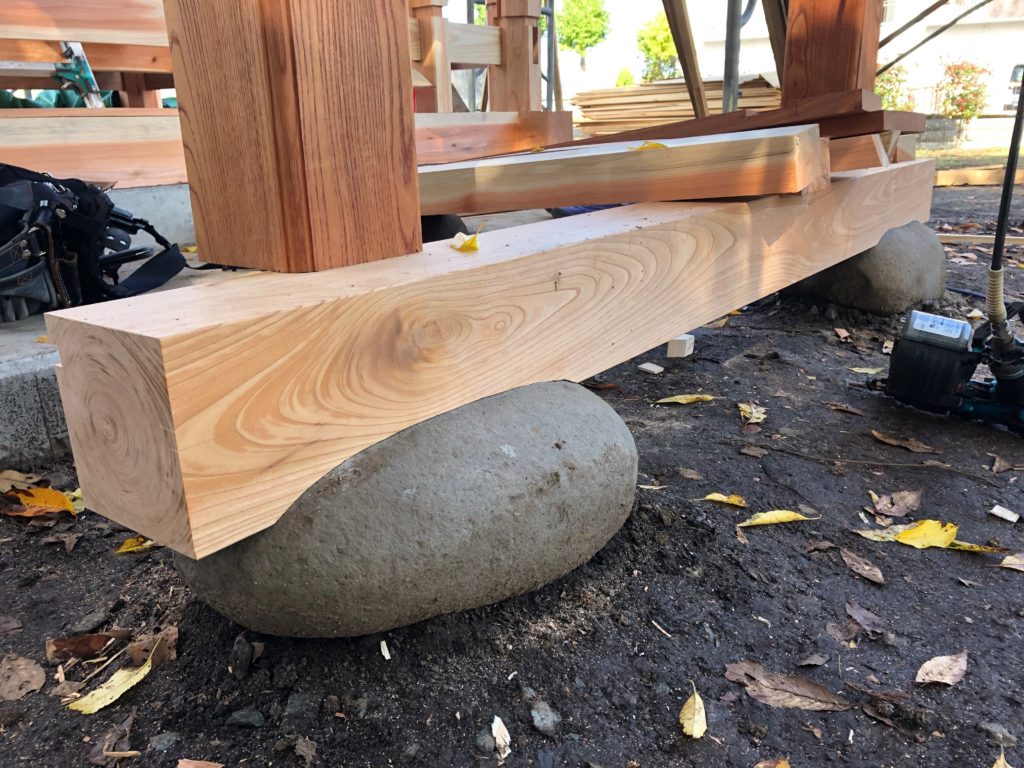 向拝柱の土台・濡れ縁床束は自然石の形状に合わせ手作業で彫っています。
