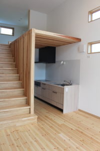キッチンには木材で組んだ格子が存在感を放ちます。